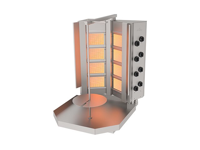 V‑tipi radyan dizilimi sayesinde geniş bir pişirme yüzeyi sunar ve aynı anda çok sayıda şişin eşit şekilde kızartılmasını sağlar. LPG ya da doğalgaz (NG) ile çalışabilme imkânı mevcuttur. Emniyet ventili sayesinde istenmeyen alev sönmelerinde gaz akışı otomatik olarak kesilir, bu da güvenli bir kullanım sunar.