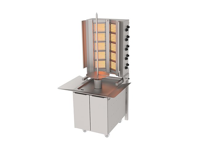Profesyonel döner üretimleri için tasarlanmış bu model, 10 gözlü radyan sistemiyle yüksek kapasiteye sahiptir. Duvara monte edilebilen yapı sayesinde yükseğe sabitlenerek yer tasarrufu sağlar ve alt arabalı veya tezgâhlı seçeneklerle entegre edilebilir. LPG ve doğalgaz (NG) seçenekleri mevcuttur; ayrıca emniyet ventili sayesinde alev sönmesi durumunda gaz akışı otomatik olarak kesilir. V‑tip geniş ısıtıcı yüzeyi ile hızlı servis imkânı sunar. İdeal ölçüleri ve yüksek güç değerleri ile restoran, döner salonu ya da otel mutfakları için güçlü bir tercih oluşturur.